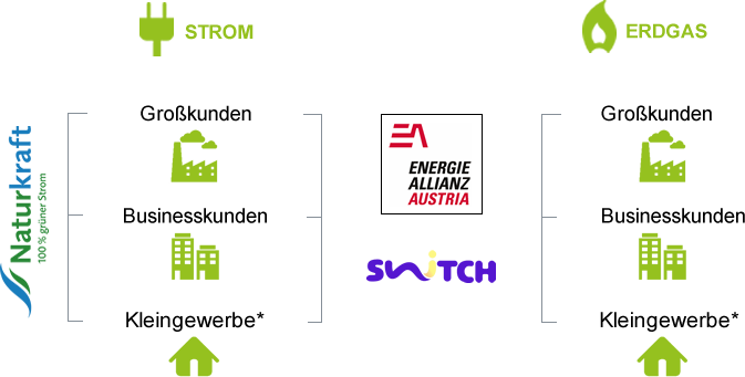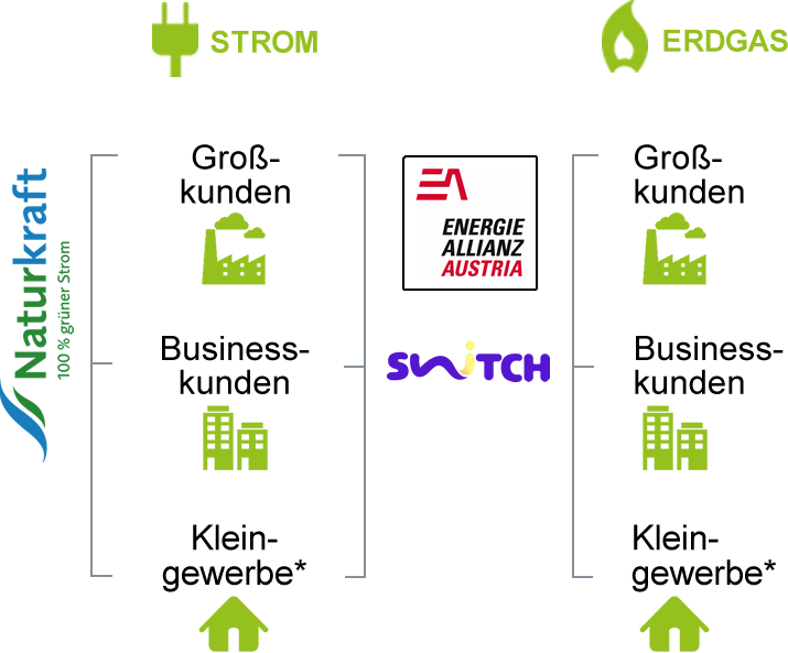 * Für Kunden im Netzgebiet der Wien Energie Vertrieb GmbH & Co KG, EVN Energievertrieb GmbH & Co KG und BE Vertrieb GmbH & Co KG bieten wir unsere Produkte für Privatkunden unter der Marke Optima, für Businesskunden unter den Marken Vario, Giga und Mega an.